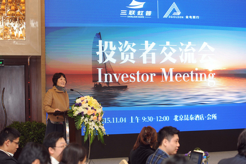 2015年11月4日,三聯(lián)虹普協(xié)同金電聯(lián)行于北京昆泰酒店成功舉辦了一場“投資者交流會”,三聯(lián)虹普董事長/總經(jīng)理劉迪女士、副總經(jīng)理李德和先生、董事會秘書/ 副總經(jīng)理韓梅女士、三聯(lián)金電董事長張敏喆先生、金電聯(lián)行董事長范曉忻先生、首席科學家朱志偉先生、董事會秘書白雪松先生、三聯(lián)金電總經(jīng)理王懿女士,出席了會議并與投資者交流,100多名基金、證券公司代表參加了會議。會議議程主要包括:三聯(lián)虹普經(jīng)營情況及發(fā)展戰(zhàn)略演講、金電聯(lián)行業(yè)務介紹演講、一站式征信業(yè)務發(fā)布及發(fā)展前景演講、投資者問答環(huán)節(jié)等。